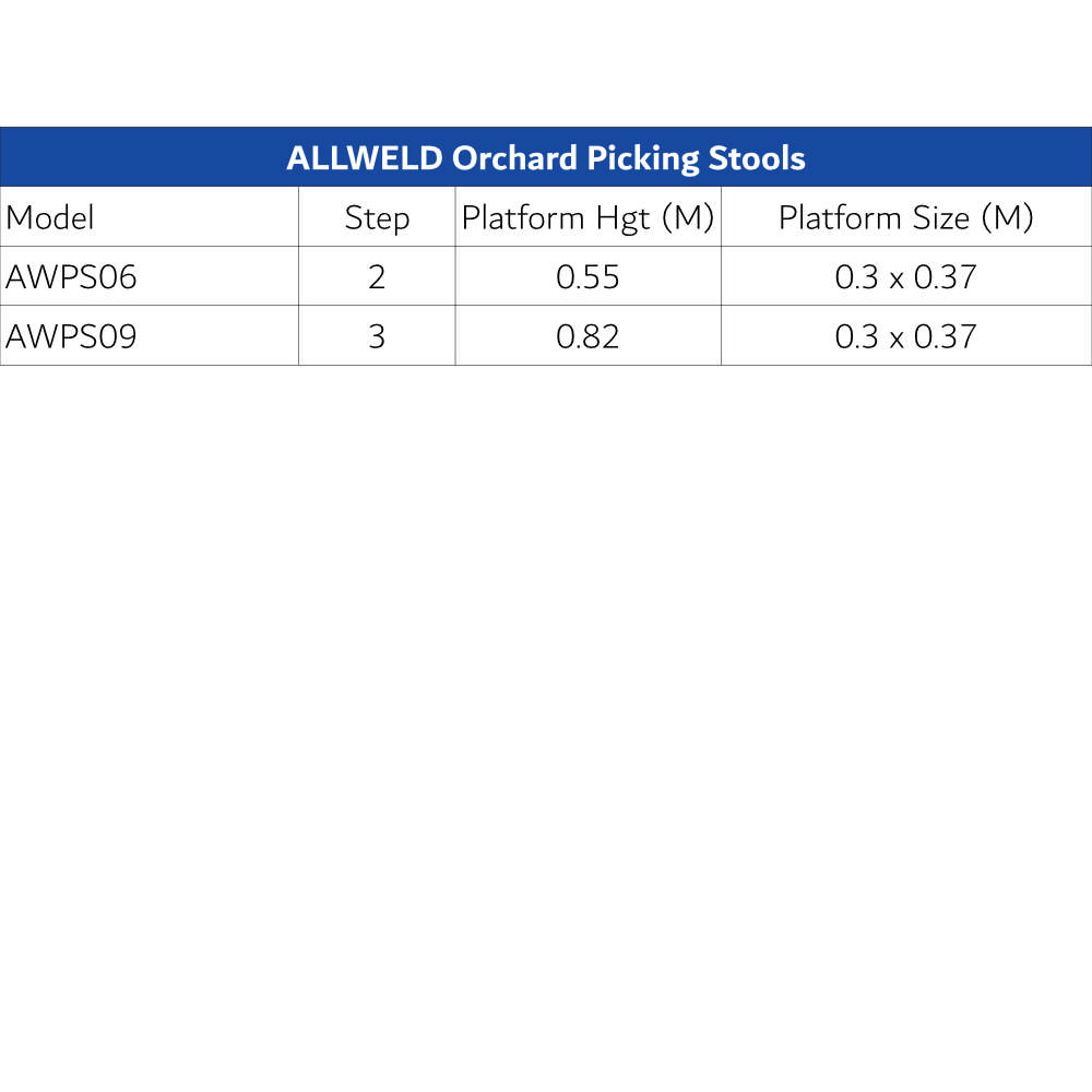Allweld has refined and developed their aluminium Picking Stool to meet the extreme demands required by the orchard industry. Fully welded from high grade 6060 T5 MF grade aluminium, the stools are extremely stable, lightweight and manoeuvrable. This increases picker’s safety, comfort and productivity.