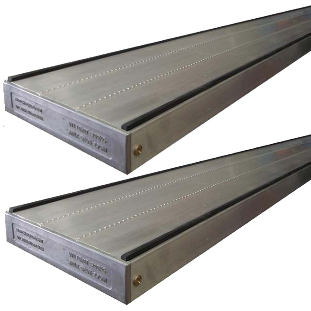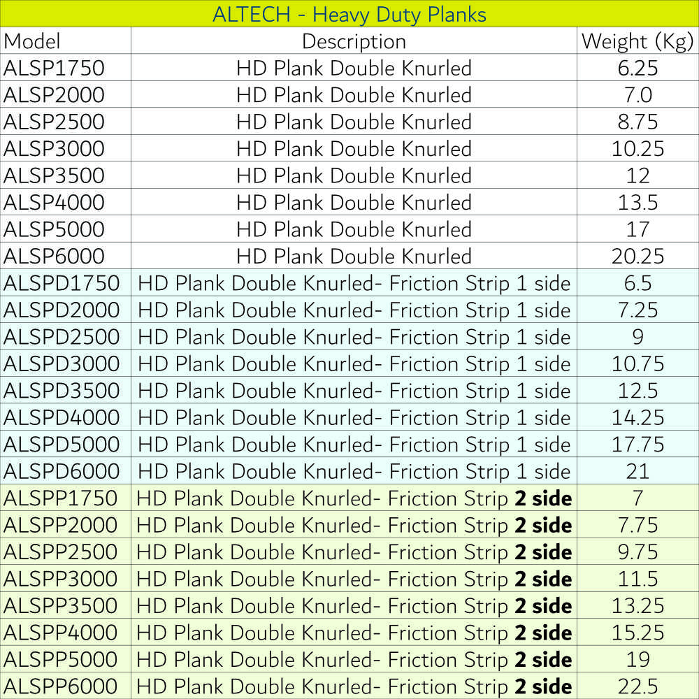 The Planks are available in Standard, Deluxe and Premium models. All planks feature four grooved knurls on each side. The Deluxe and Premium planks also feature rubber friction strips for a firm foothold. All planks have cast aluminium end caps. These caps are fitted with countersunk head rivets ensuring there are no protruding heads or unsightly welded joints. They also feature two strong internal strengthening webs. These webs provide increased stiffness and greater resistance to impact.
