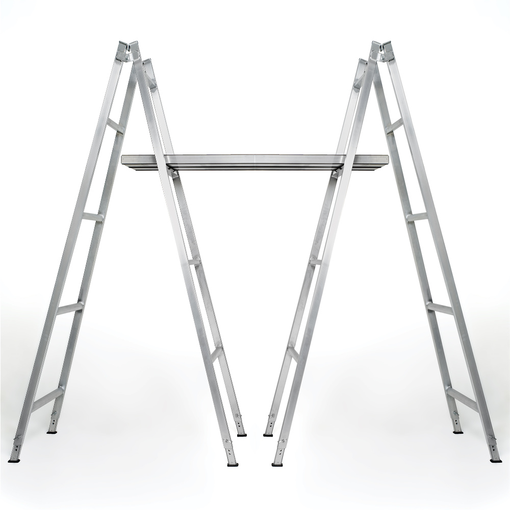 These aluminium trestles are light yet tough, and come with telescopic or fixed legs. The stiles are spaced to support a 450mm wide twin-plank platform. Set up as single or multiple bays and the telescopic legs will allow up to 260mm of height variations