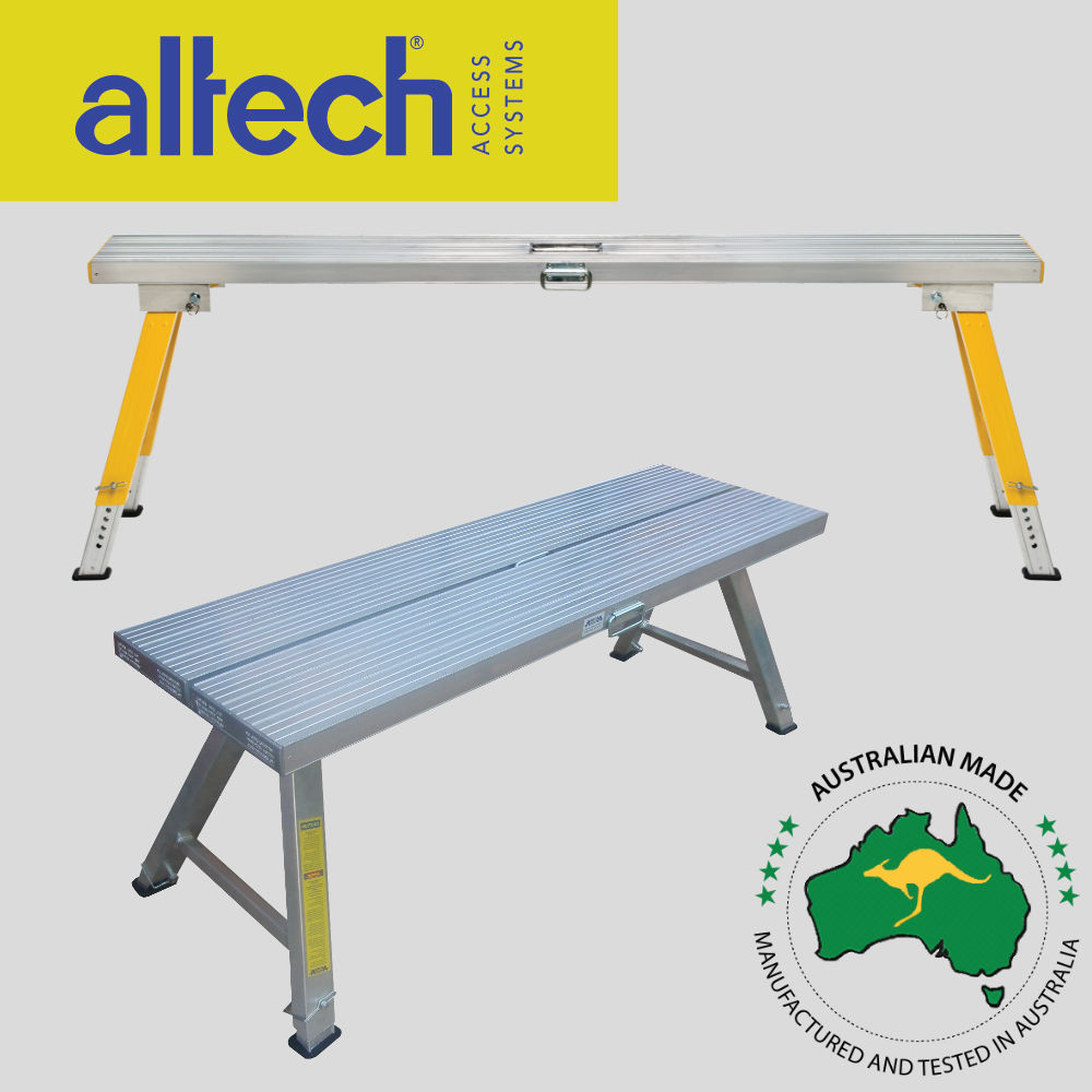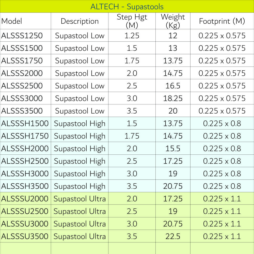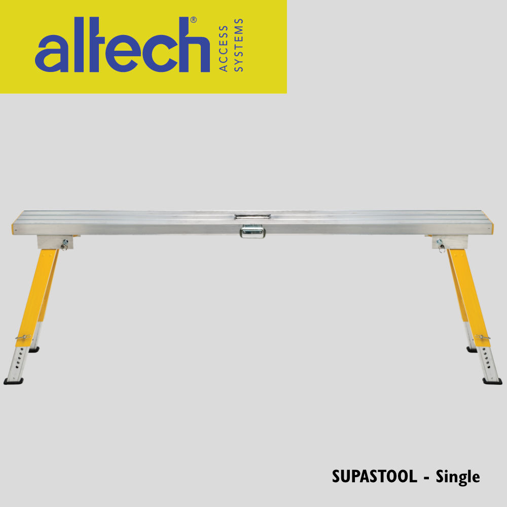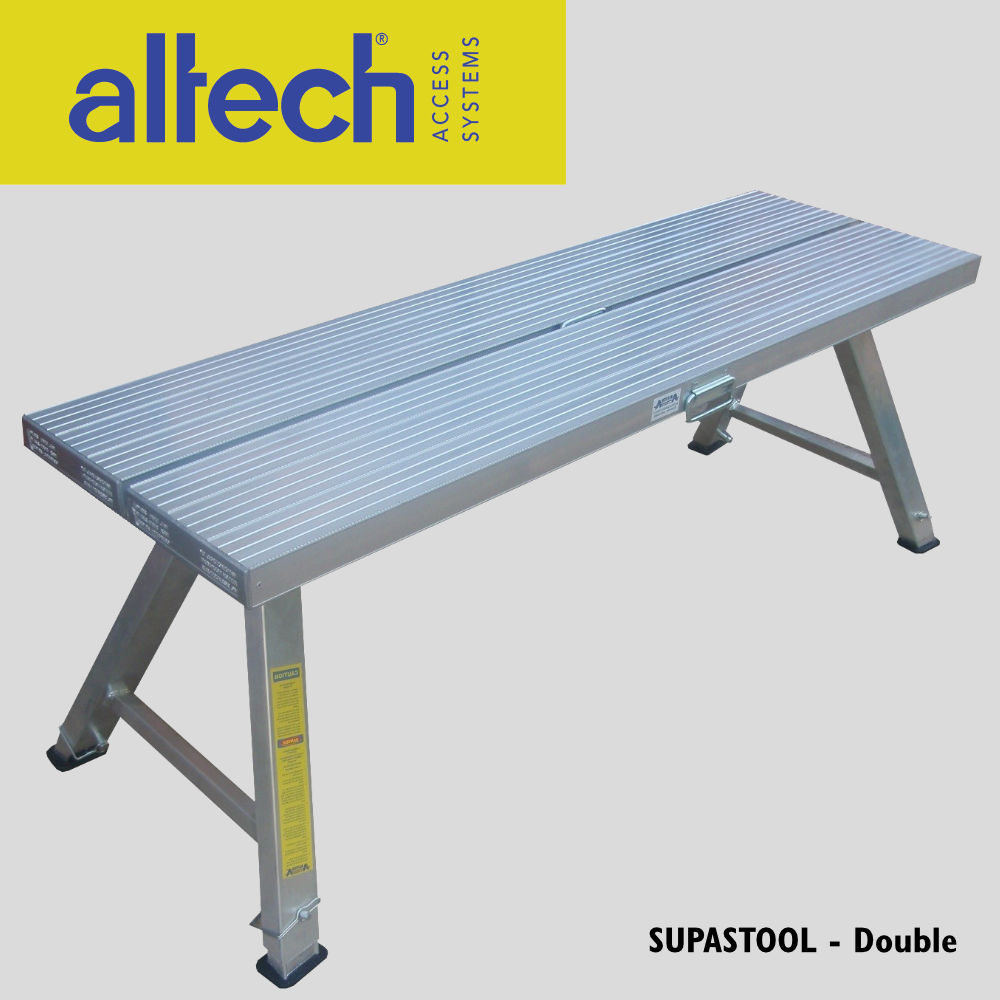 Altech Super Stools also offer greater convenience than trestle ladders and a plank. Available in a choice of heights and features. The spring-loaded locking system secures the stool legs in place in both the closed and open position. They are light, tough, Quick to set up and have handles to carry them when folded and also when in use.