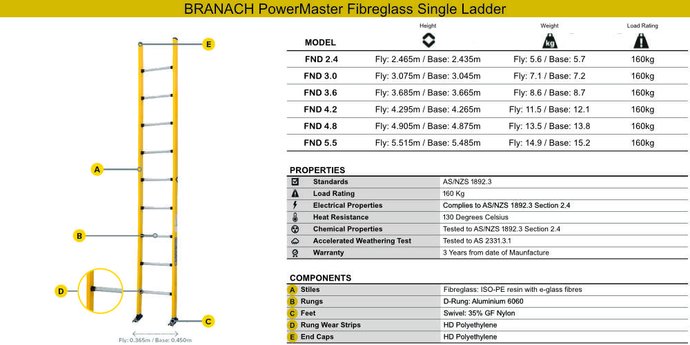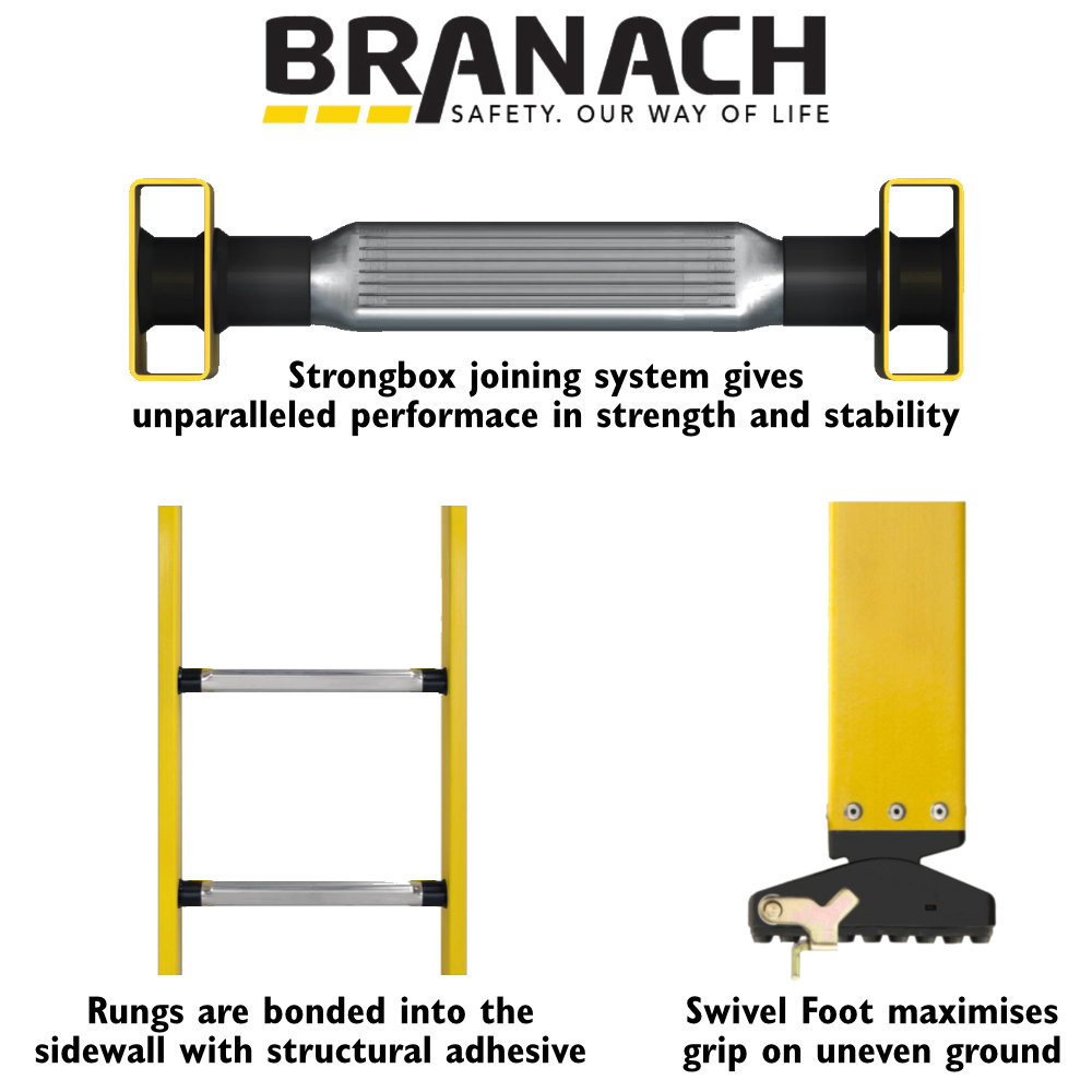 BRANACH Fibreglass Single Scaffold Ladders. Are as safe as they are tough. With durable and repairable Strongbox construction,