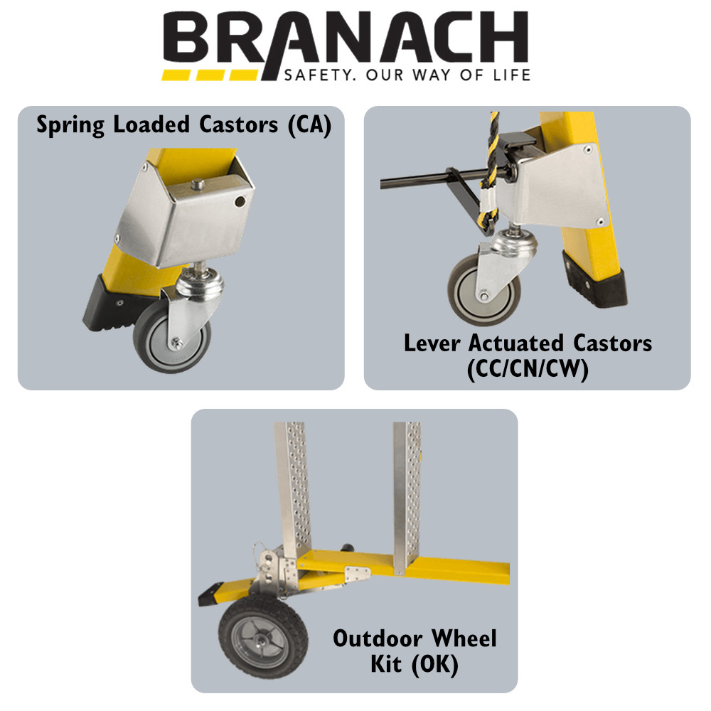 Castors provide an efficient means of moving step-platforms. Workmaster Mobile Step-Platforms have two methods to provide mobility with castors. Platform heights up to 1.8 meters use castors with springs (CA model). The default position of these castors allows the ladder to move easily. Under the weight of the user the castors retract therefore making the ladder stationary. Castors with springs are practical if you need to frequently re-position your ladder. For example around a factory floor or large flat areas.