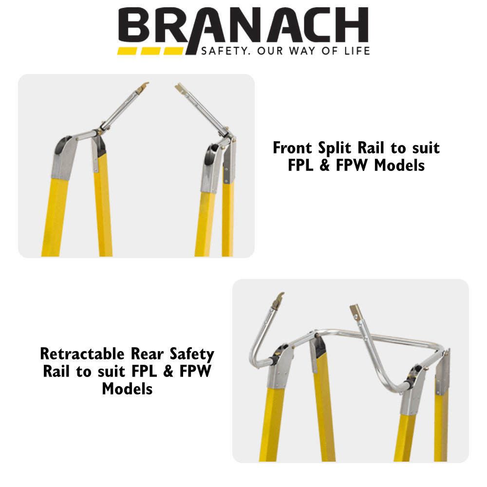 Branach Safety Rails are available for both the front and rear of platforms on FPL & FPW platform ladder range.