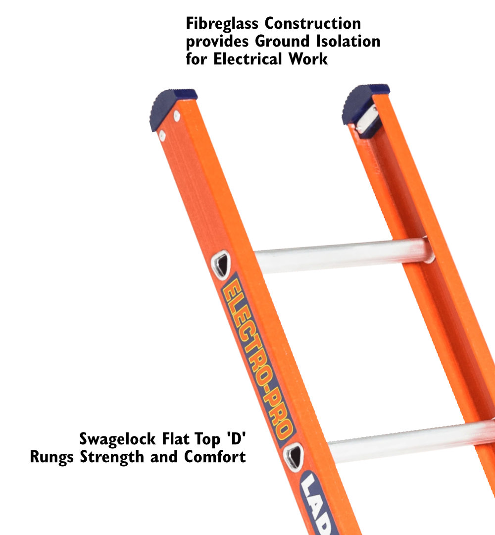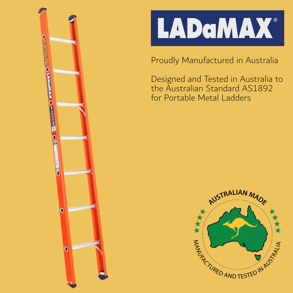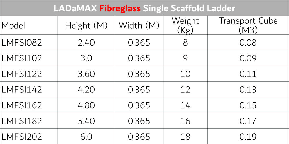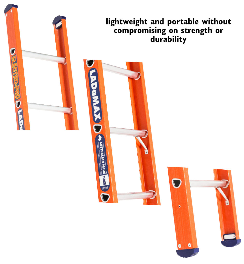 LADaMAX Fibreglass Single Scaffold Ladders. A Fibreglass Single Ladder that is lightweight and portable without compromising strength or durability providing the ultimate in height safety for Electrical work.