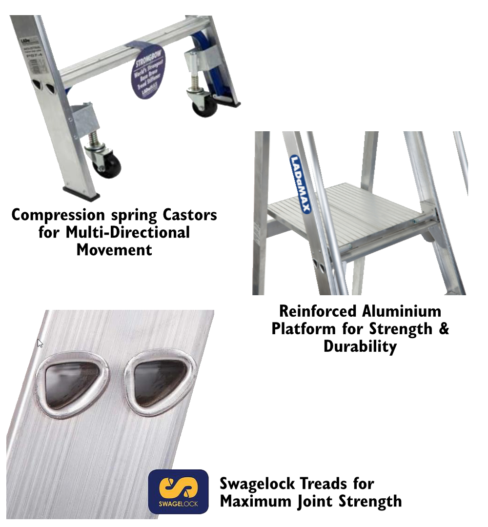 Ladders up to 1.8 meters have full gusset bracing at the ladder base, ladders over 1.8 meter use a Strongbow brace. Safety is enhanced with a platform safety rail as well as fully integrated handrails and large solid feet provide good grip and as a result extra resistance to movement.