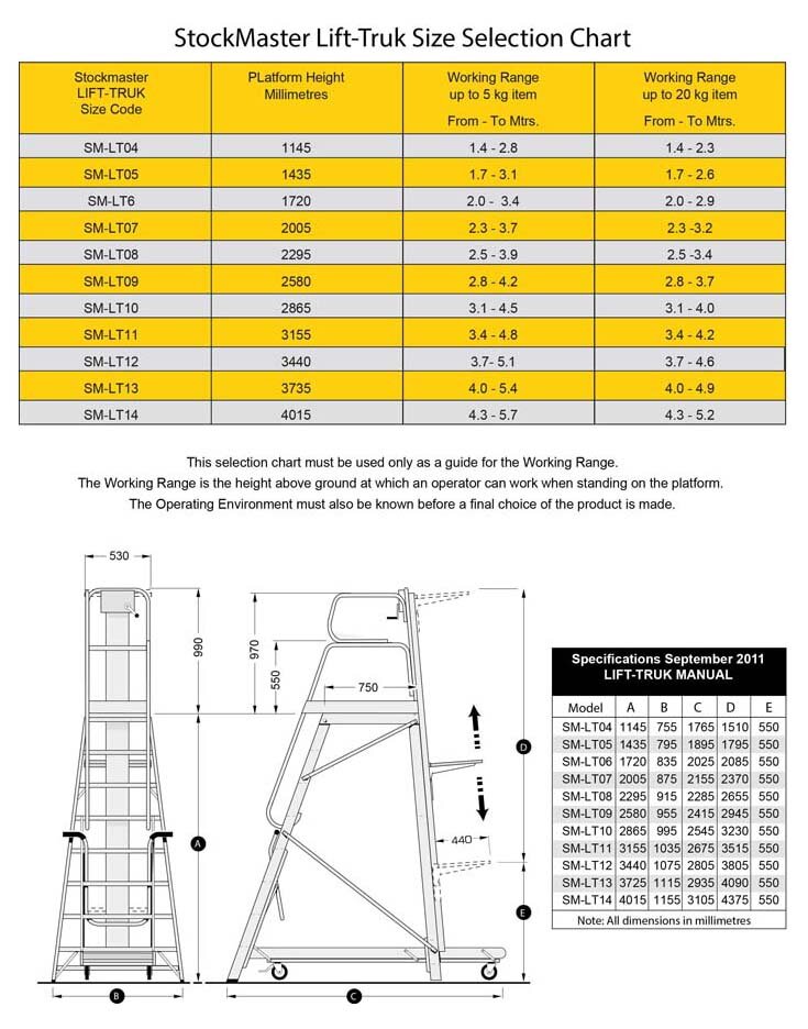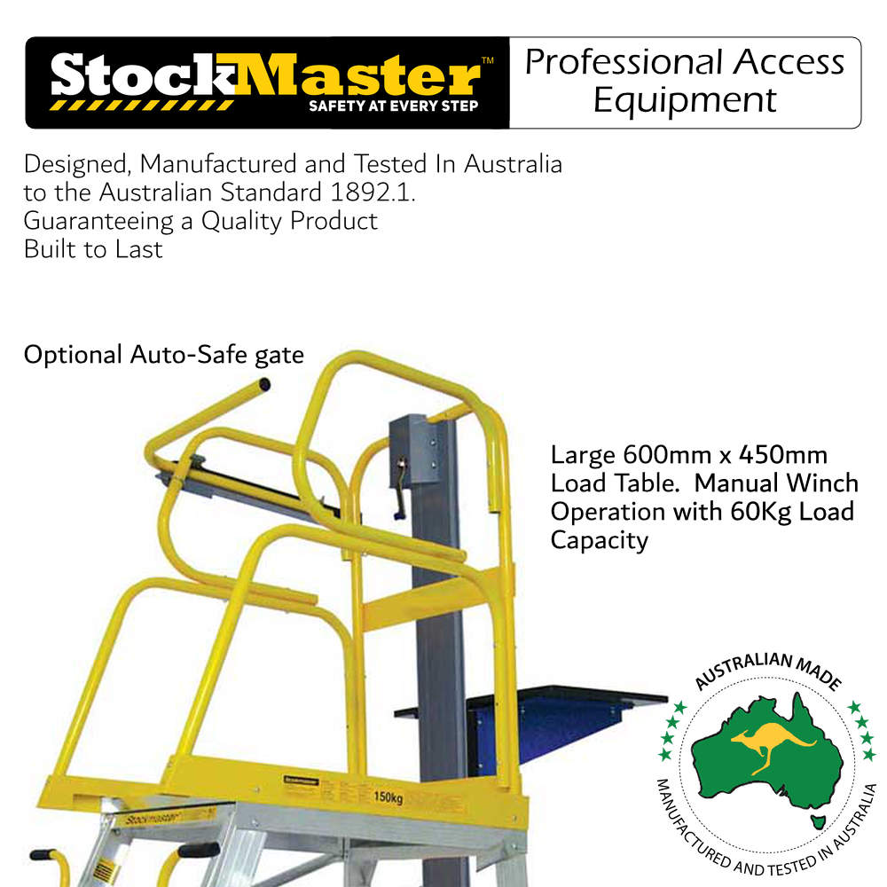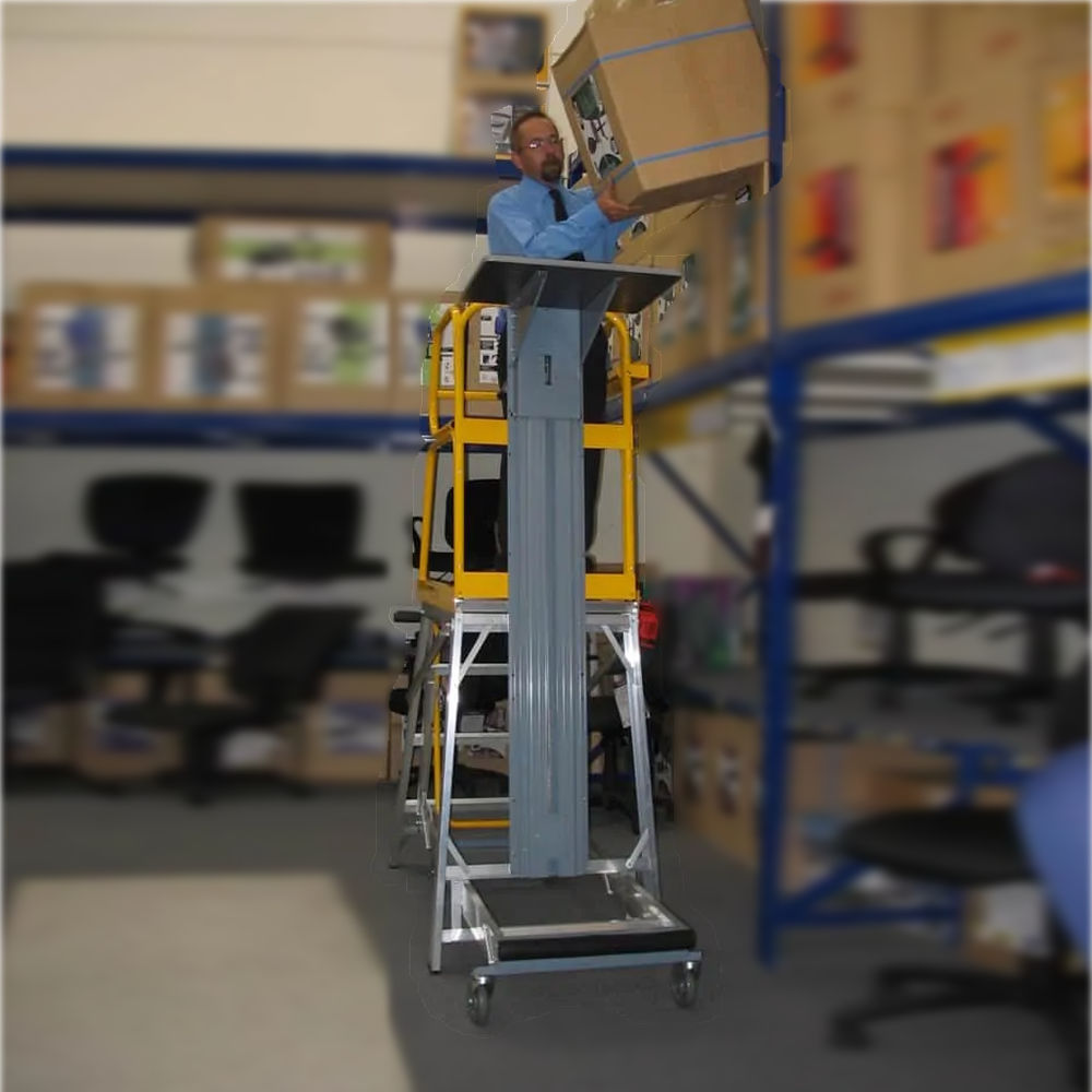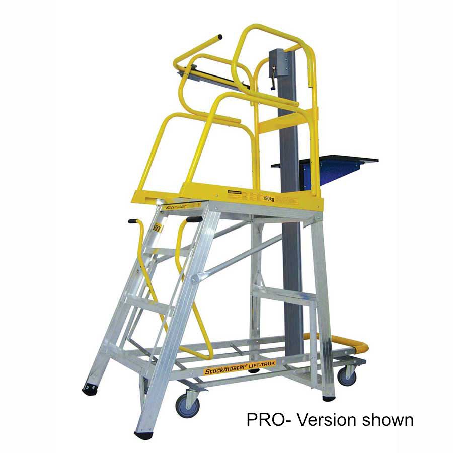 Stockmaster Lift Truk is a safe and easy to use lifting platform ladder that is mobile only when you are moving it.
