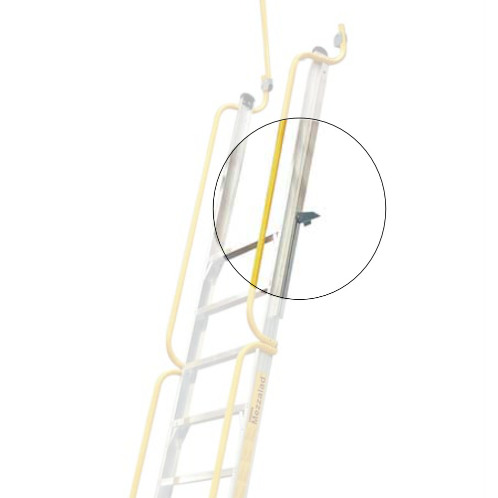 The Mezzalad Mounting Brackets fasten to either the upper floor or wall. Holes are provided for use of fastening to timber, steel or masonry. With the use of additional bracket sets, the Mezzalad becomes a relocatable mezzanine ladder able to be used at multiple locations. The attachment or detachment of the ladder from the brackets is a simple push, lift and drop action.