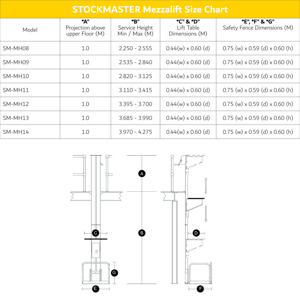 StockMaster Mezzalift is available in seven sizes with a reach height between 2.555 meters and 4.275 meters. The maximum load is 60 kilos. All sizes adjust to match the exact height of your mezzanine. The maximum range of adjustment is 305 millimeters.