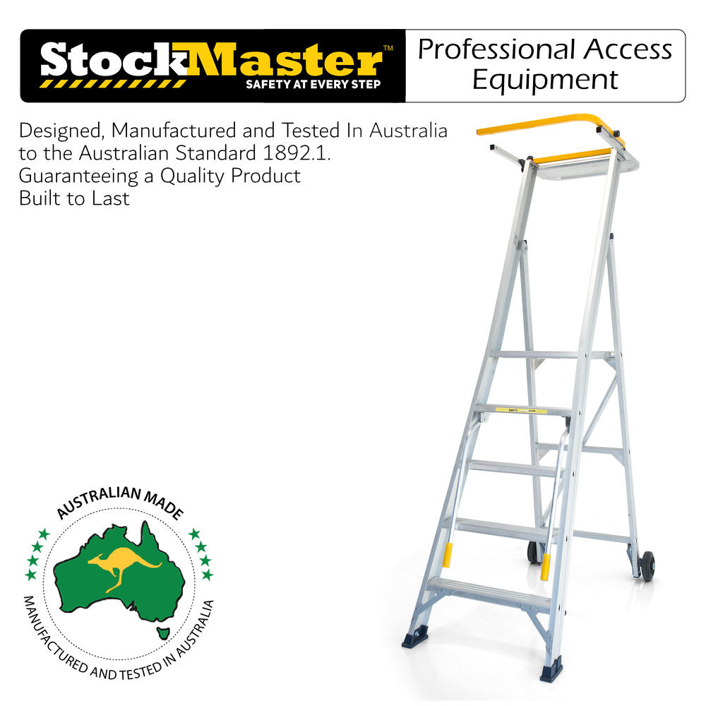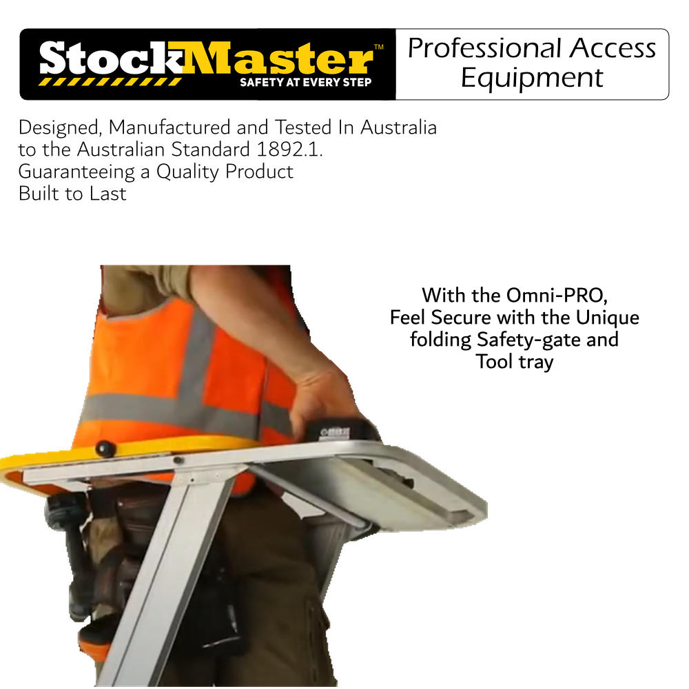 The StockMaster OmniPRO is a safe, portable and strong mobile work platform. Whether you need a platform ladder for indoors or out, Omni is the platform ladder you can use everywhere. Featuring two large wheels and a single control for braking and steerng, OmniPRO moves easily in the open position without lifting or dragging. Simply take up the control and move it. Release the control, and OmniPRO is automatically in safe mode with no risk of moving as you commence to climb. All instability associated with designs that use spring loaded castors is eliminated, and there is no movement as you work on the platform.