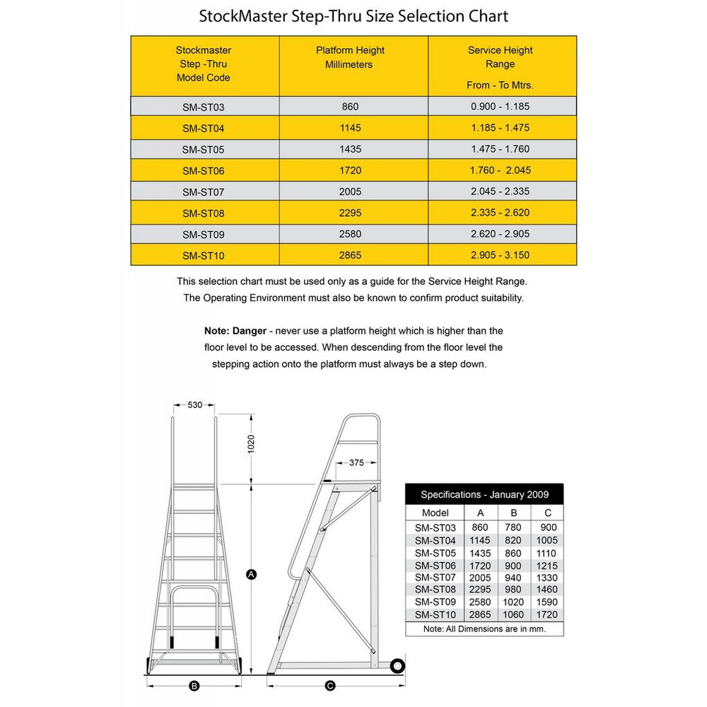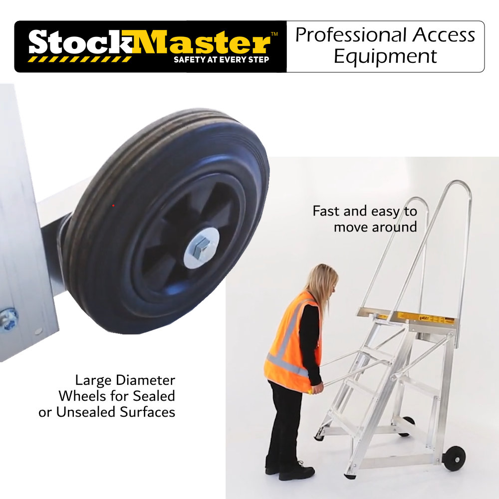 Fast, flexible and safe access for Transport Vehicles, Loading Docks, and Mezzanines. With two large diameter wheels the StockMaster Step-Thru Mobile Access Ladder moves easily over sealed or unsealed surfaces. It also moves easily over slopes and is ideal for indoor or outdoor use. Featuring just one control it is fast and easy to move around.