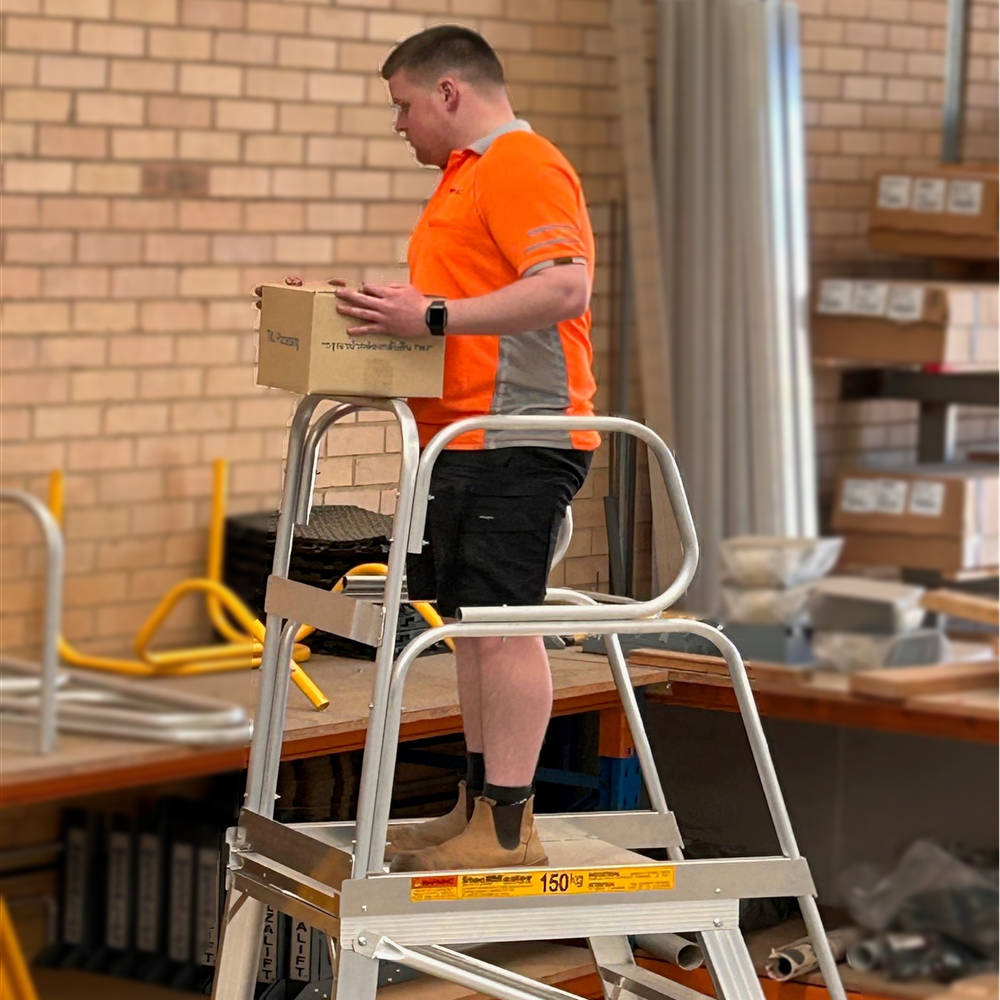 StockMaster TrackerPRO is a versatile and also easy to use mobile work platform. With two large diameter wheels it moves easily over sealed and unsealed surfaces. It is ideal for indoor as well as outdoor use. Featuring a single control to steer and brake it is fast and easy to move around. To move to the job take hold of the control and raise the unit to the mobile position. Release the control and the ladder brakes and is completely stable.