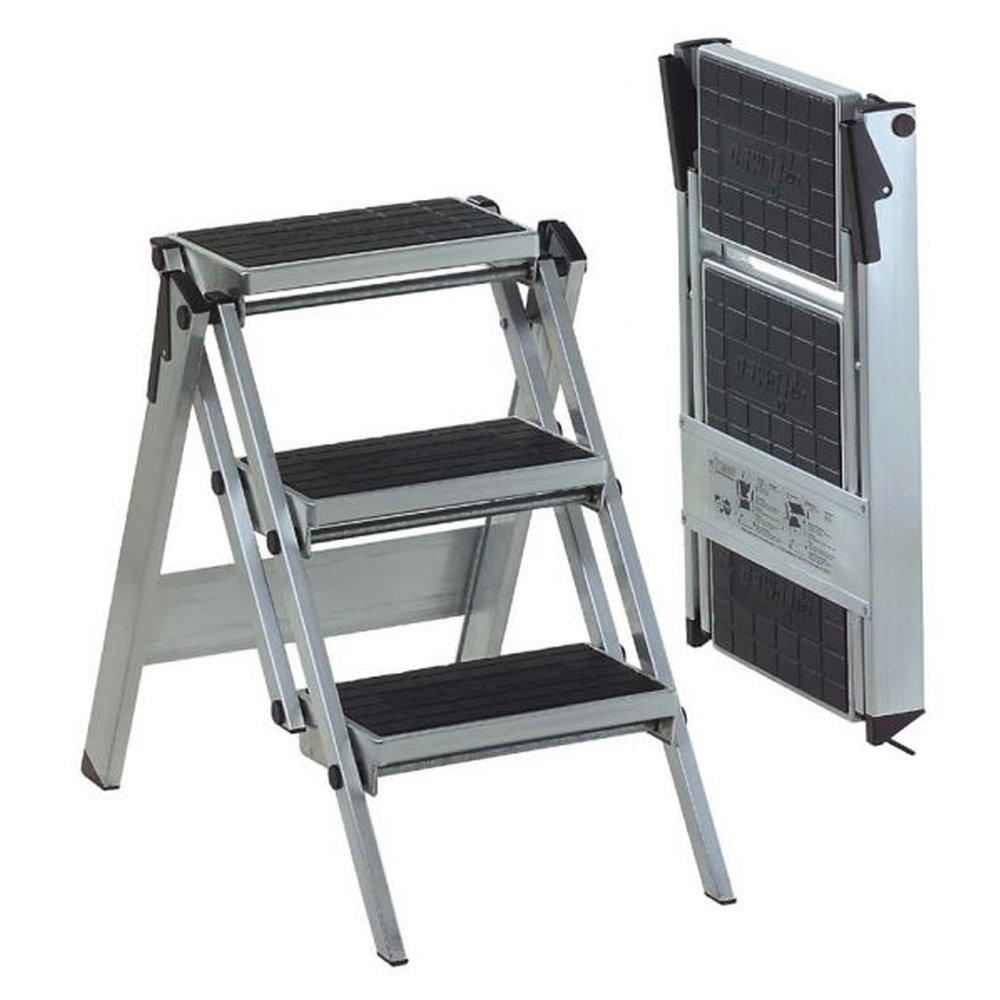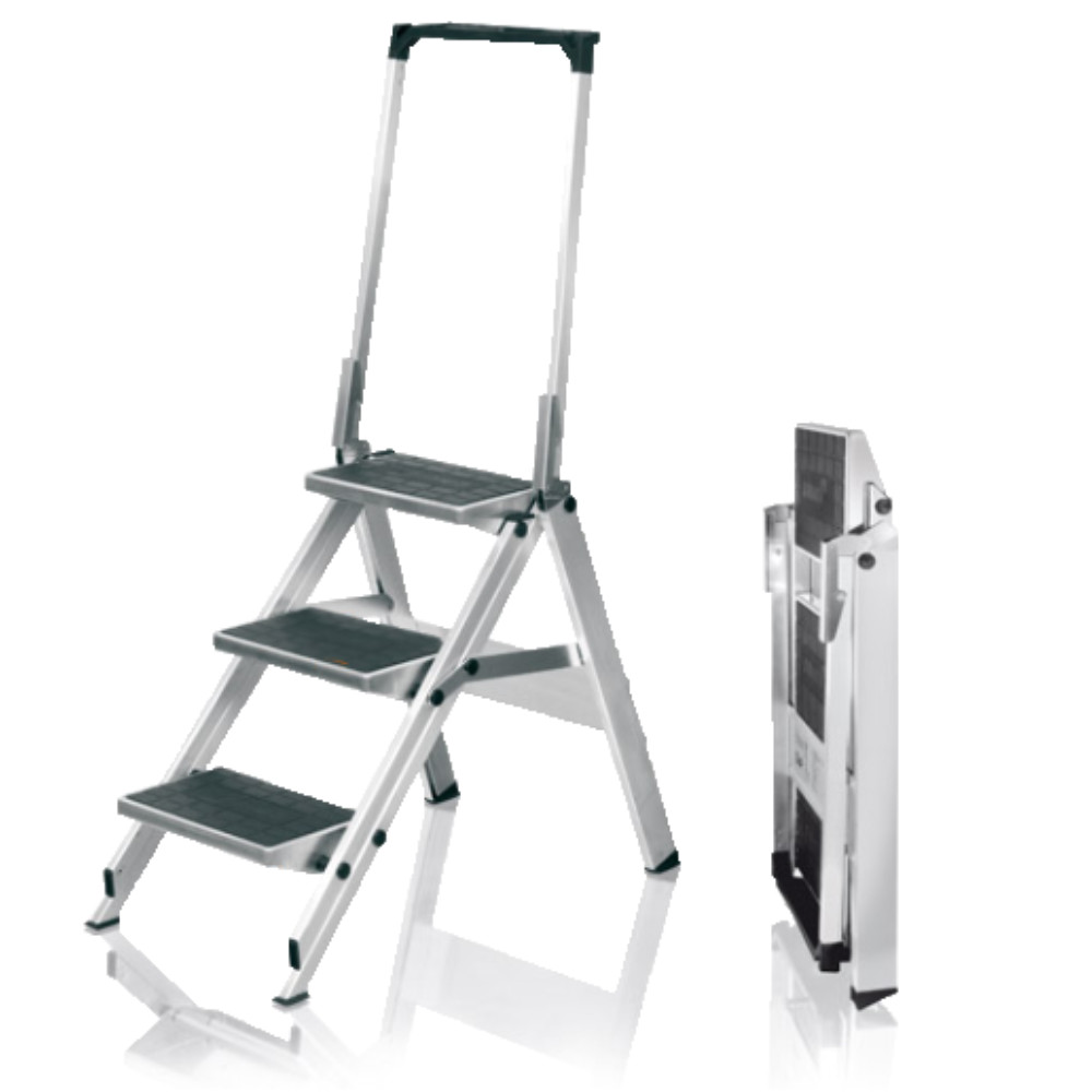 Made in Germany by WAKU the Little Jumbo safety step is a stable, stable, safe and reliable stairway step ladder you can depend on. Extra wide non-slip steps for face forward descent and floor protecting non-slip ladder feet plus a Fold Down Safety Bar with Tool Storage option. Folds for easy storage. Available sizes are 2 to 5 steps (including the top step) from 0.46 meter to 1.150 meter. The load rating is 150 Kilo.